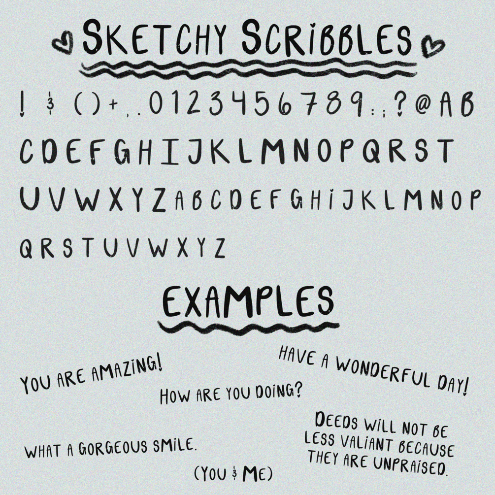 In this download you will find both .TFF and .OTF files of my Sketchy Scribbles font. This font is my own quick go to handwriting and features tiny hearts on top of the letter “i”.